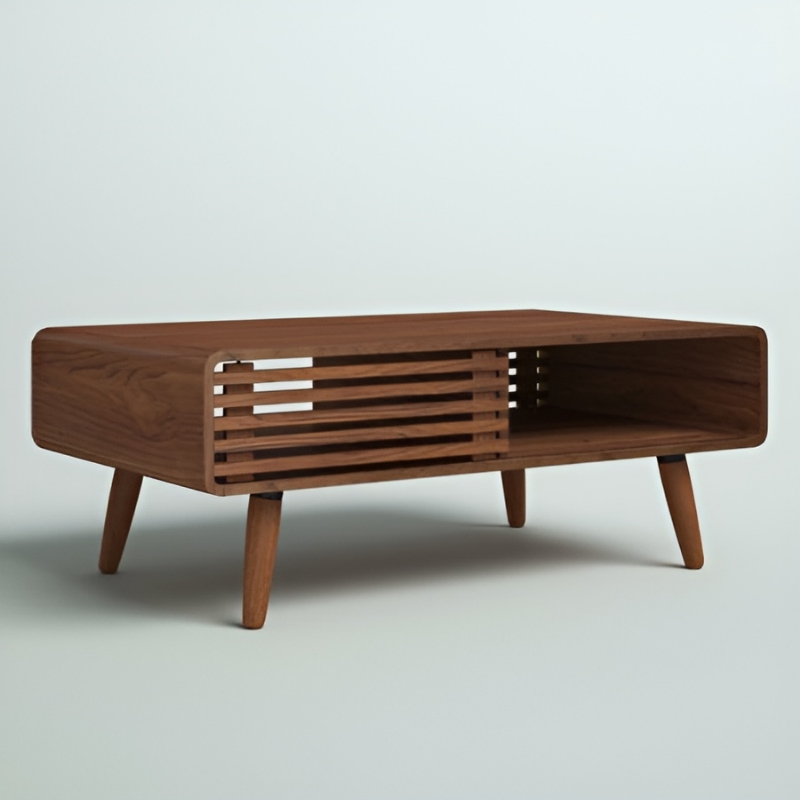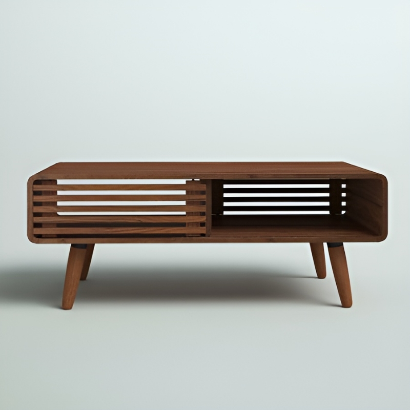 Mid-century modern with decorative wooden slats and a cutout magazine and book shelf.
