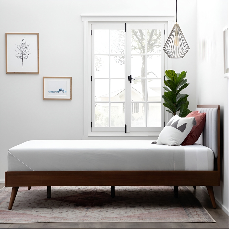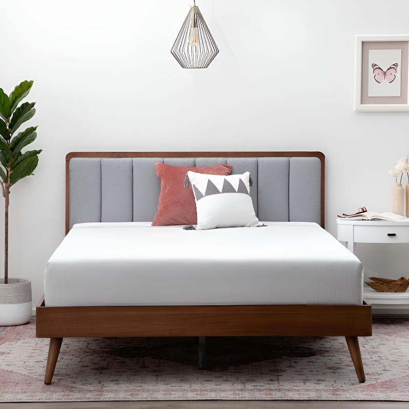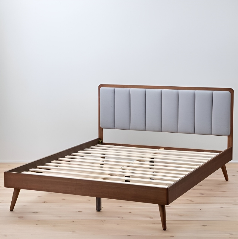 Channeled fabric inset into a headboard with a raised platform. Also available as a fully upholstered platform.