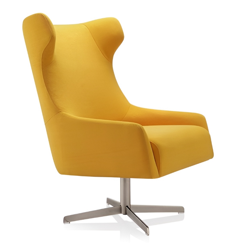 Relaxing retreat chair with a high winged back, a broad seat cushion and a crisscross metal base.