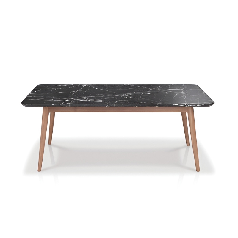 Mid-century design at its simplest. The perfect piece of stone sits atop contrasting wooden legs.