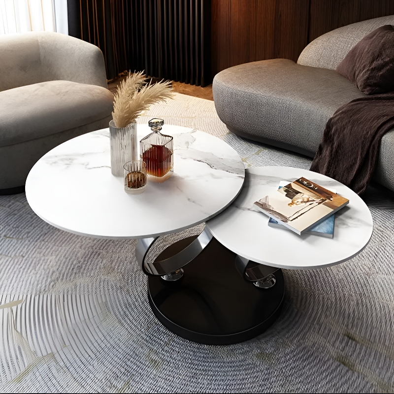 Bunching cocktail tables in quartz or porcelain with a metal base. Custom sizing is available.