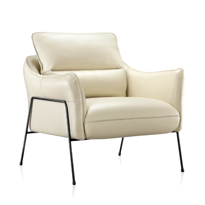 This lavish leather chair with its upslope arms features a thickly cushioned tight-fitting seat and a loose back cushion with an attached bolster pillow. A simple metal frame finishes this modern look.