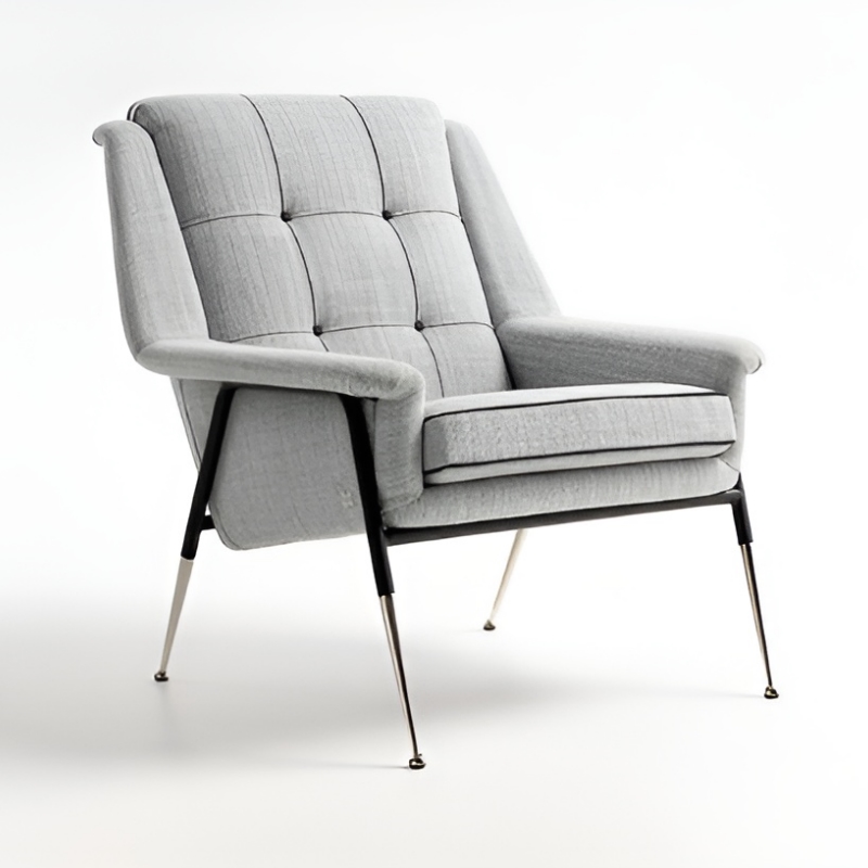 Italian design at its best. This striking chair with its tilted and tufted back and contrasting coloured buttons and trim make this a one-of-a-kind chair. All of this beauty sits atop mixed metal legs.