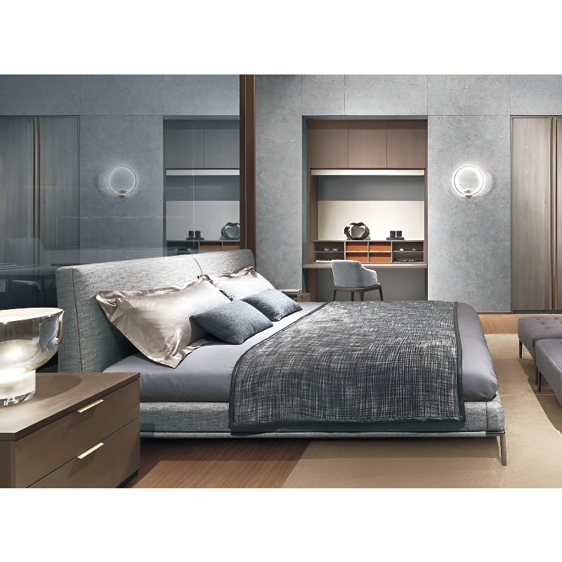 This headboard and matching platform base with its simple chrome legs provides an elegant finish.